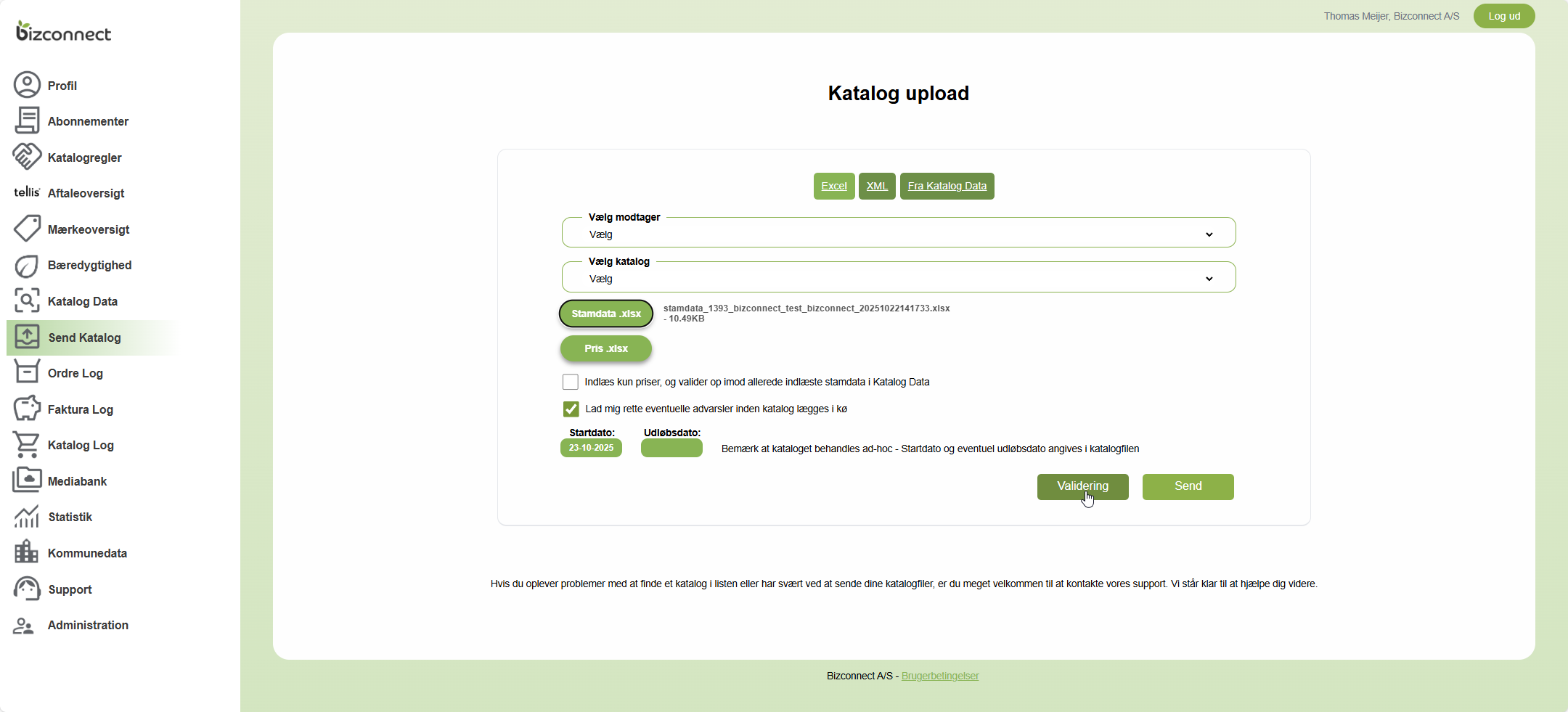 Bemærk: Der udføres automatisk validering, når du trykker Send, så du behøver ikke validere manuelt, hvis du allerede arbejder med et komplet sæt stamdata og prisfiler.