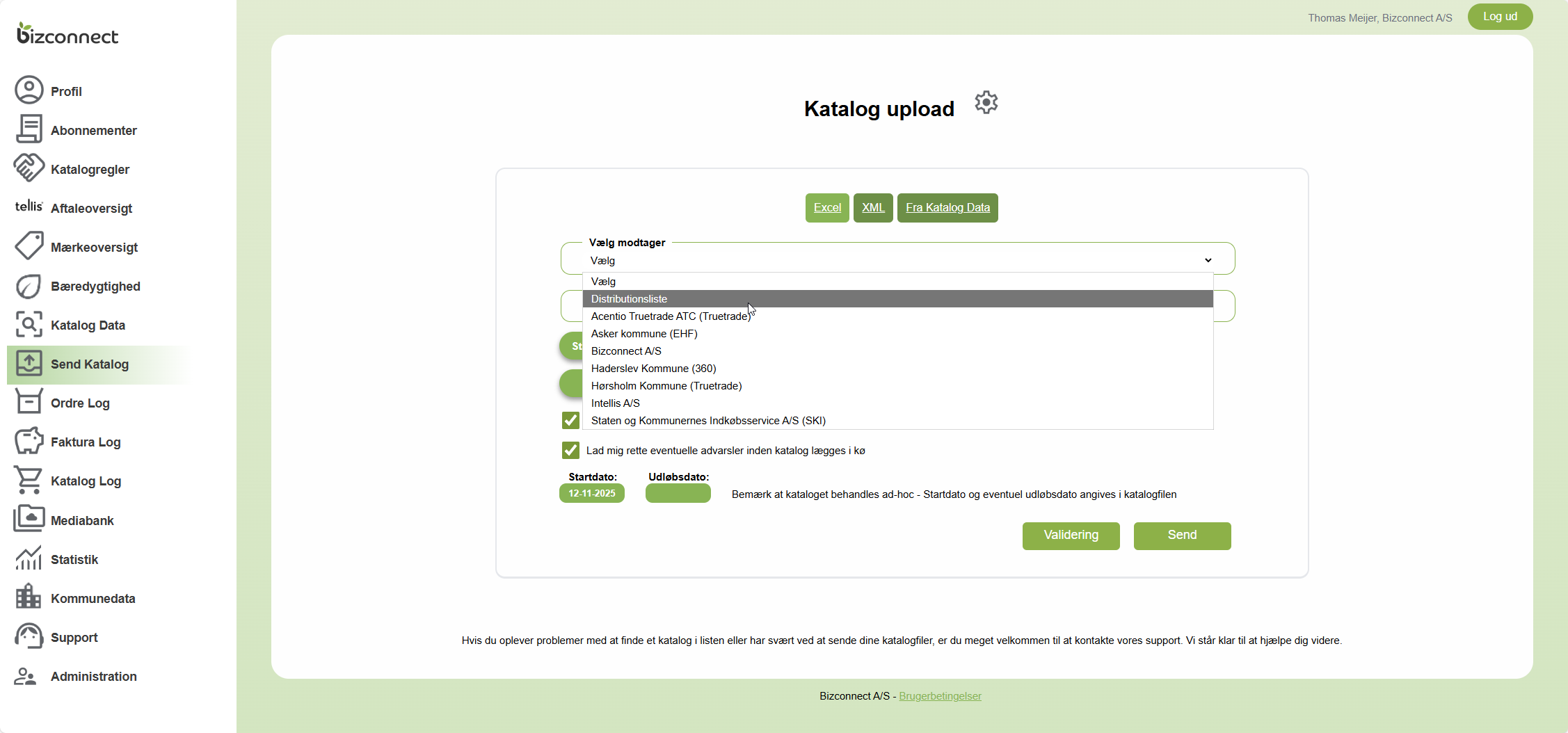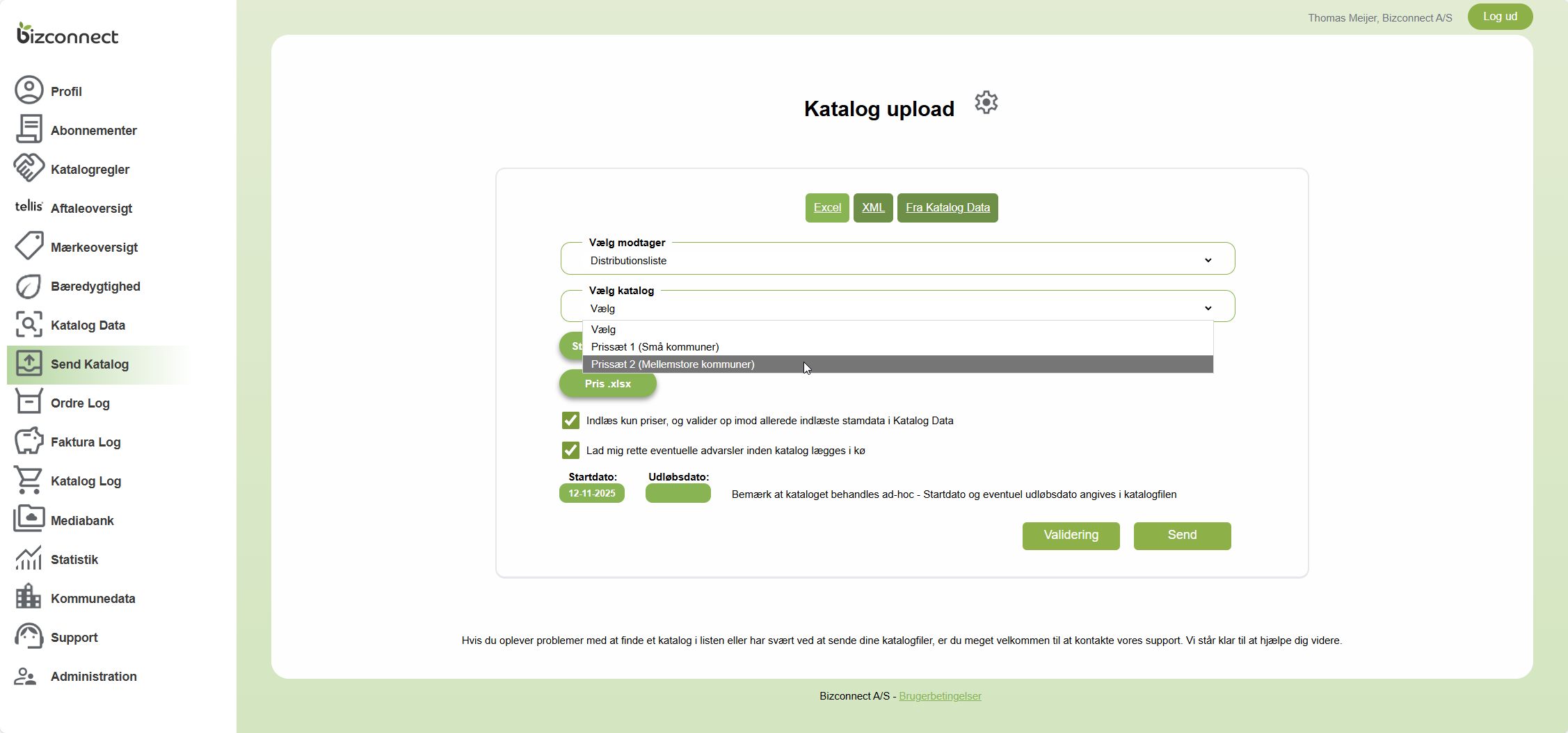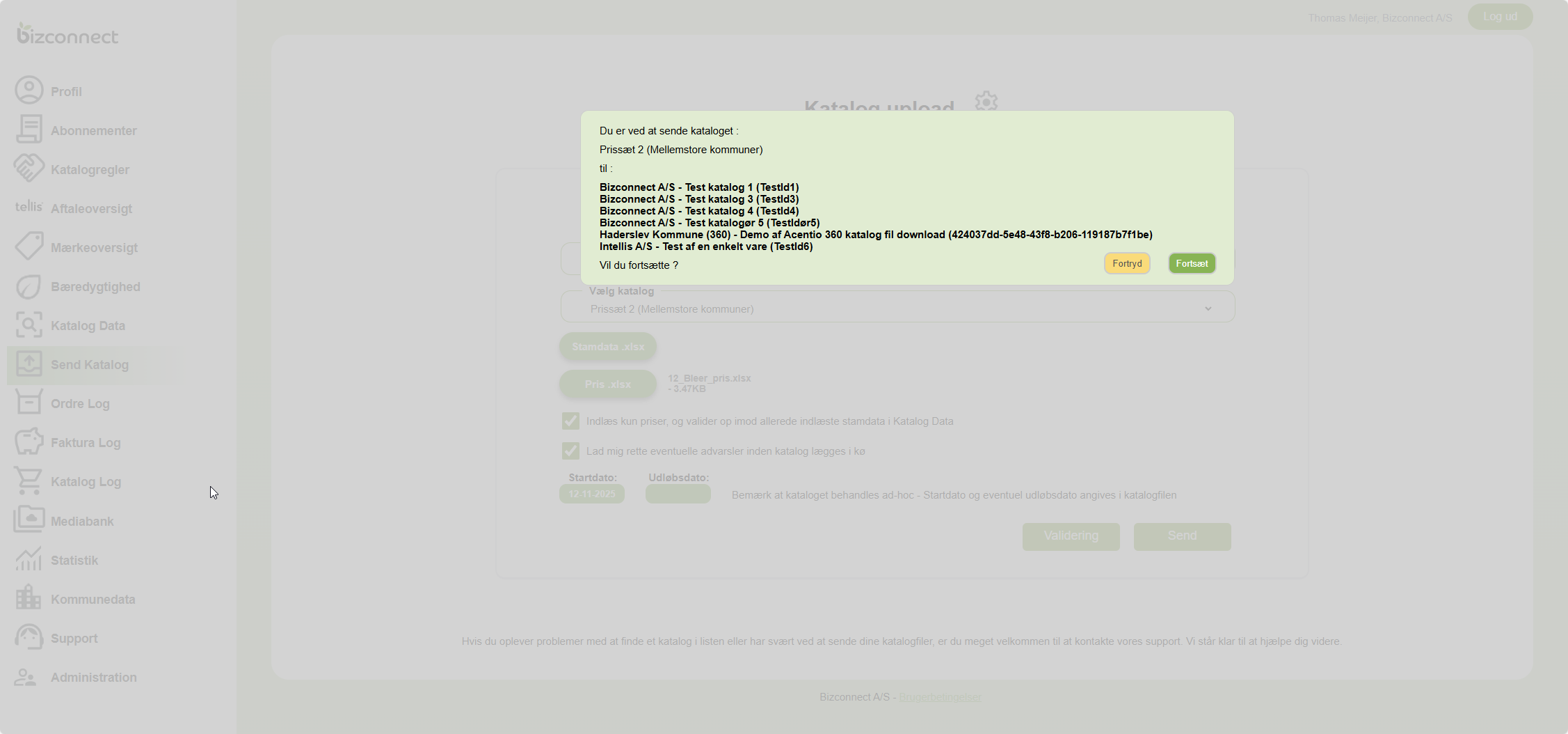 Nu kan du vælge en prisfil og evt. en stamdatafil og trykke Send, hvorefter du skal bekræfte at du nu vil sende det aktuelle katalog til distributionslistens modtagere. Du kan både se kunde, eventuel portal, katalognavn samt katalog ID.