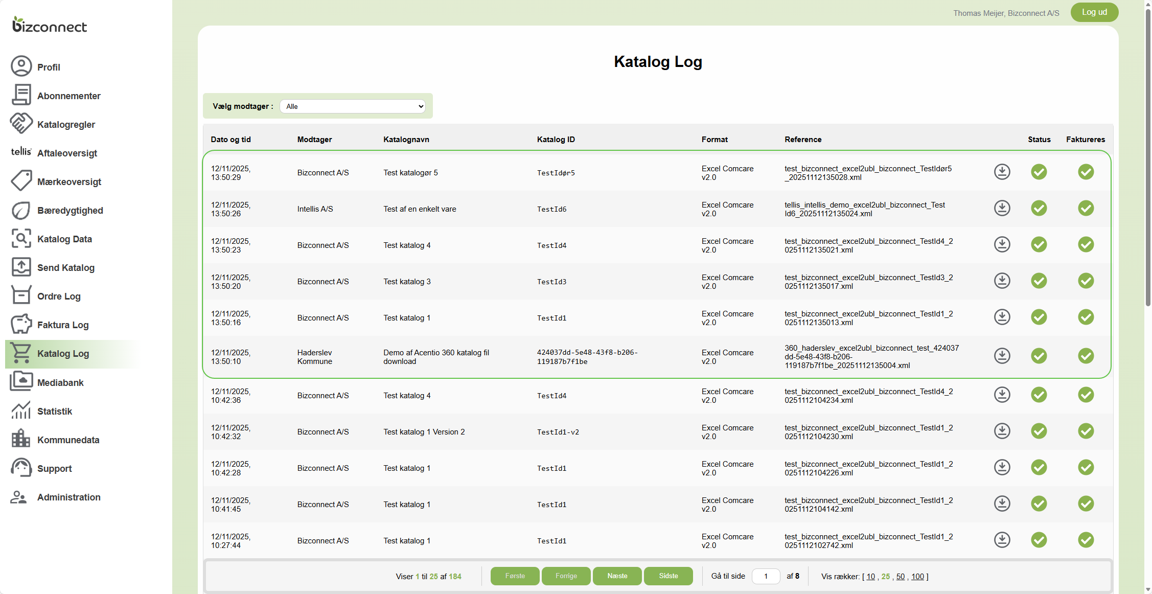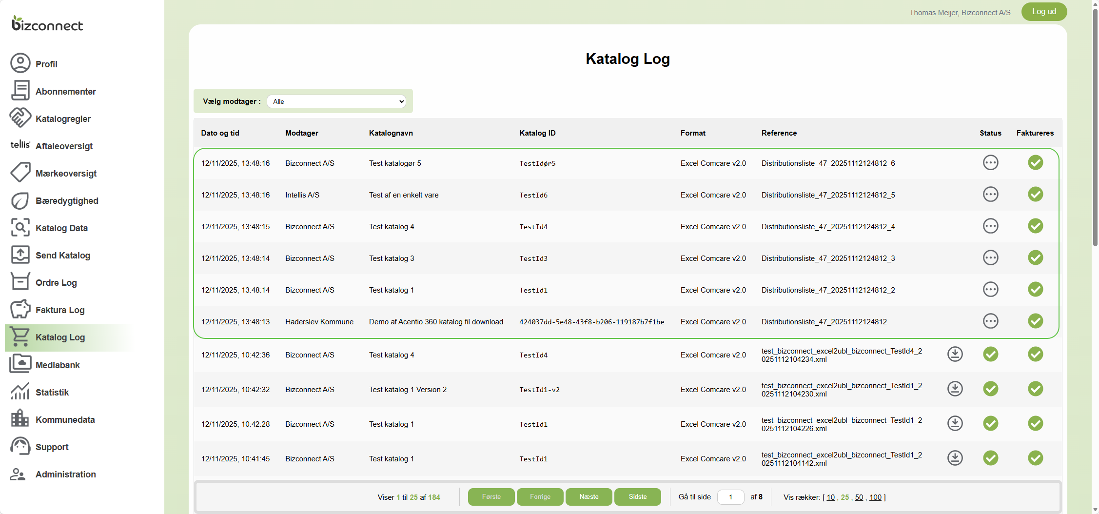 Efter bekræftelsen så lægger Bizconnect alle katalogerne i kø, og du kan følge dem i Katalog Log.