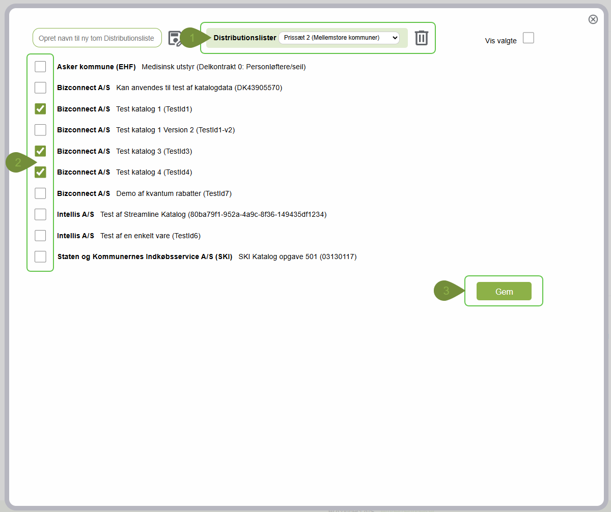 2) Vælg de kataloger som du ønsker denne distributionsliste skal gælde for, iblandt dine aktive katalogregler.