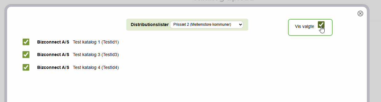Ved valgt distributionsliste, så vises en checkboks. Vis valgte giver et samlet overblik over de aktuelle kataloger på den valgte distributionsliste. Denne funktion kan være en hjælp til overblikket ved mange katalogregler.